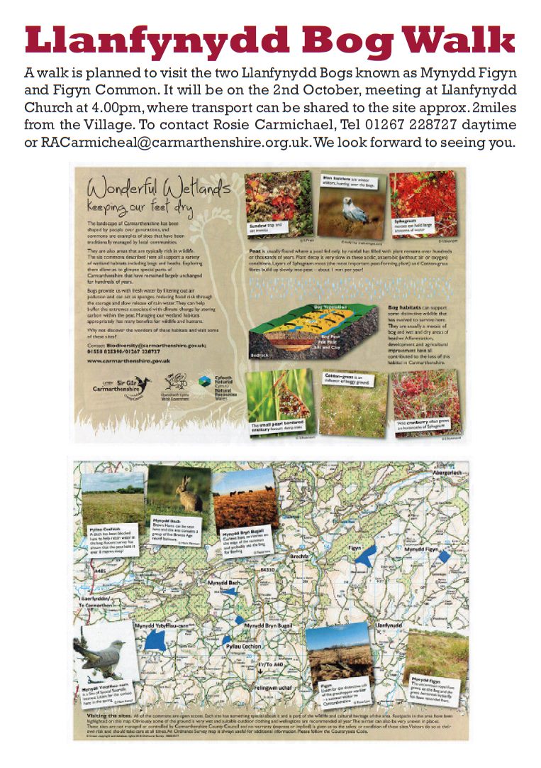A walk is planned to visit the two Llanfynydd Bogs known as Mynydd Figyn and Figyn Common, on 2nd October, meeting at Llanfynydd Church at 4.00pm, where transport can be shared to the site approx. 2miles from the Village.